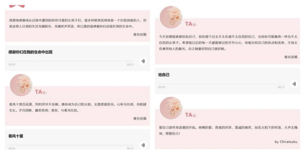 投稿结束后,我们择优选取八篇投稿做成特别版推送,并于3月8日妇女节当天发布。在特别版推送中,“大美女”同学用真挚的话语诉说着对朋友白杨的感激与祝福:“我在人间贩卖黄昏,只为收集温柔去见你”,她们互为彼此的玫瑰,共同度过温柔岁月;佚名同学用独特的粤语感谢朋友们在她的生命中出现,让她的生活充满阳光与欢声笑语;“一个口口”同学深情表白母亲—“请让我一直爱你!”;吴智深同学将一首温柔的歌送给她的母亲,“偶尔也会闪出星星,这都是形容你的眼睛”,希望她永远平安喜乐;Chiratsuku和佚名同学祝愿自己永远真诚坦荡,做自己,“爱自己是终身浪漫的开始”;佚名同学以一首美好的诗歌“春风十里”,送给所有平凡却伟大的女性 。