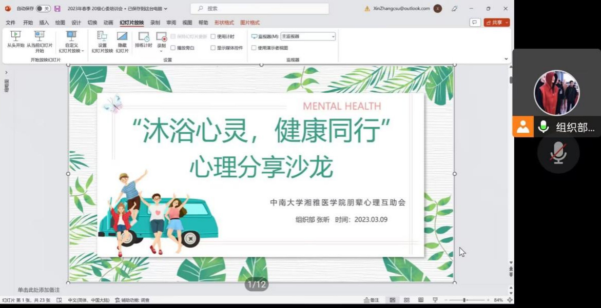 为帮助心理委员更好地了解与掌握自身的责任与任务,树立目标、端正工作态度,以最佳的状态投入到工作中去,帮助同学们保持一个良好健康的心态,拥有更加美好和谐的校园生活,湘雅医学院朋辈心理互助会2023年3月9日晚于线上召开了“沐浴心灵,健康同行”心理分享沙龙活动。本次活动由湘雅心助会指导老师、心理专干王丹老师主讲,湘雅心助会组织部张昕同学主持,湘雅医学院20级全体心理委员参加。