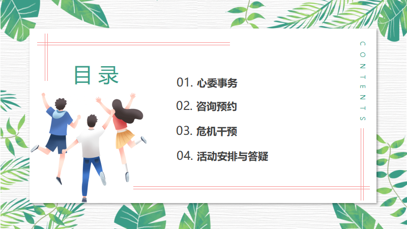 活动伊始,主持人向大家介绍了本次活动的基本内容,主要包括心委事务、咨询预约、危机干预、近期活动安排与答疑四个板块。主持人向各位心委简要介绍了本学期的心委评分细则,从半月报填写、会议参与情况、医心雅谈投稿等方面提出详细的规定,帮助心委更好地了解和完成工作内容。