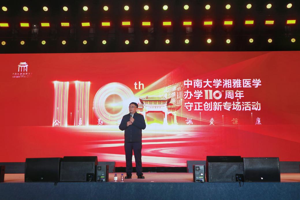 陈翔常务副校长致辞,代表学校和湘雅医学院向支持与保障此次湘雅医学办学110周年系列活动顺利开展的全体师生和关心湘雅医学发展的社会各界人士表示感谢。他指出,母校与母亲一样,蕴含着一切美好的情感,希望广大校友常回家看看。湘雅将不忘初心,赓续前行,为祖国医药卫生事业发展作出新的贡献。在这个充满温情与感动的时刻,陈翔常务副校长带领全场齐唱生日快乐歌,对湘雅表达了最热烈最美好的祝福。