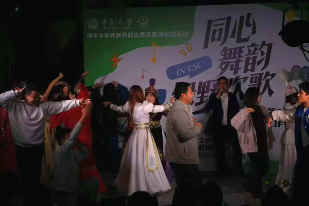 18:30,演出正式拉开序幕。多民族歌舞在灯光与音乐的交织中映入眼帘。灵动的舞姿、悠扬的旋律、热烈的节拍,构成一幅鲜活的文化长卷。现场不时响起合唱与互动环节,观众掌声雷动、齐声歌唱,热烈氛围一浪高过一浪。哈萨克族群舞《黑走马》承着轻松愉快乐曲入场,舞姿刚强有力,团结与自豪在旋律中共振;民乐演奏《权御天下》,传统乐器与流行热曲的结合迸发新活力;古丽尼嘎尔一支《阿图什赛乃姆》,舞步轻快,服饰华彩与节奏律动交织,视觉与听觉的双重盛宴;哈利老师的《欢乐跳起来》,台上台下手把手学动作,笑声与掌声把距离瞬间拉近……正式演出引得台下小伙伴情绪高涨,开放麦不停歇。部分同学即兴登台演唱《日不落》等歌曲,一齐融入欢乐和谐的氛围中。此时此地,人人都是主角,人人都是文化的传播官。