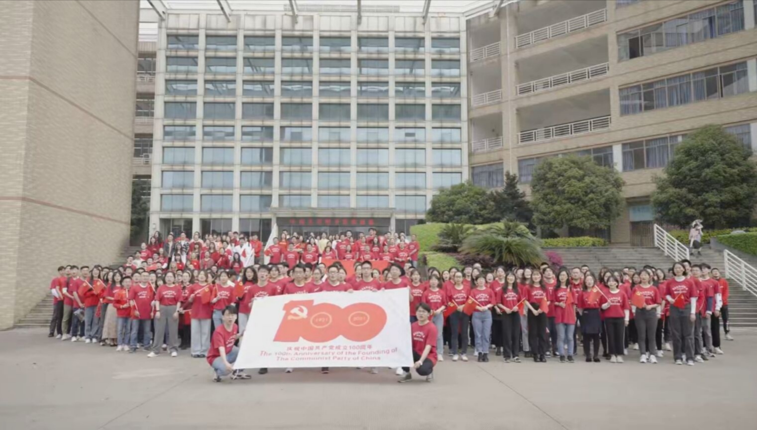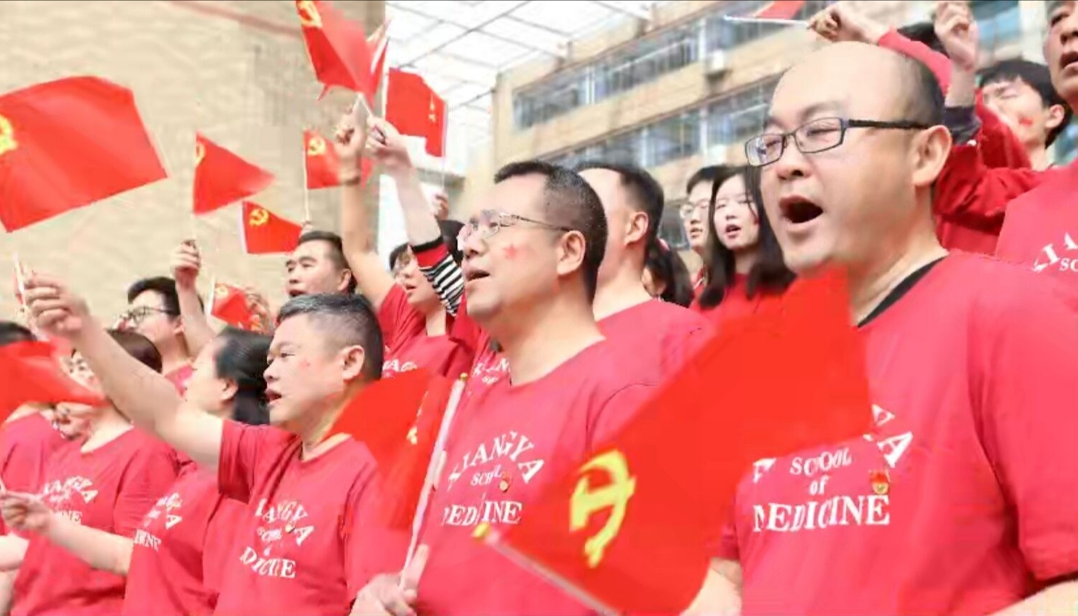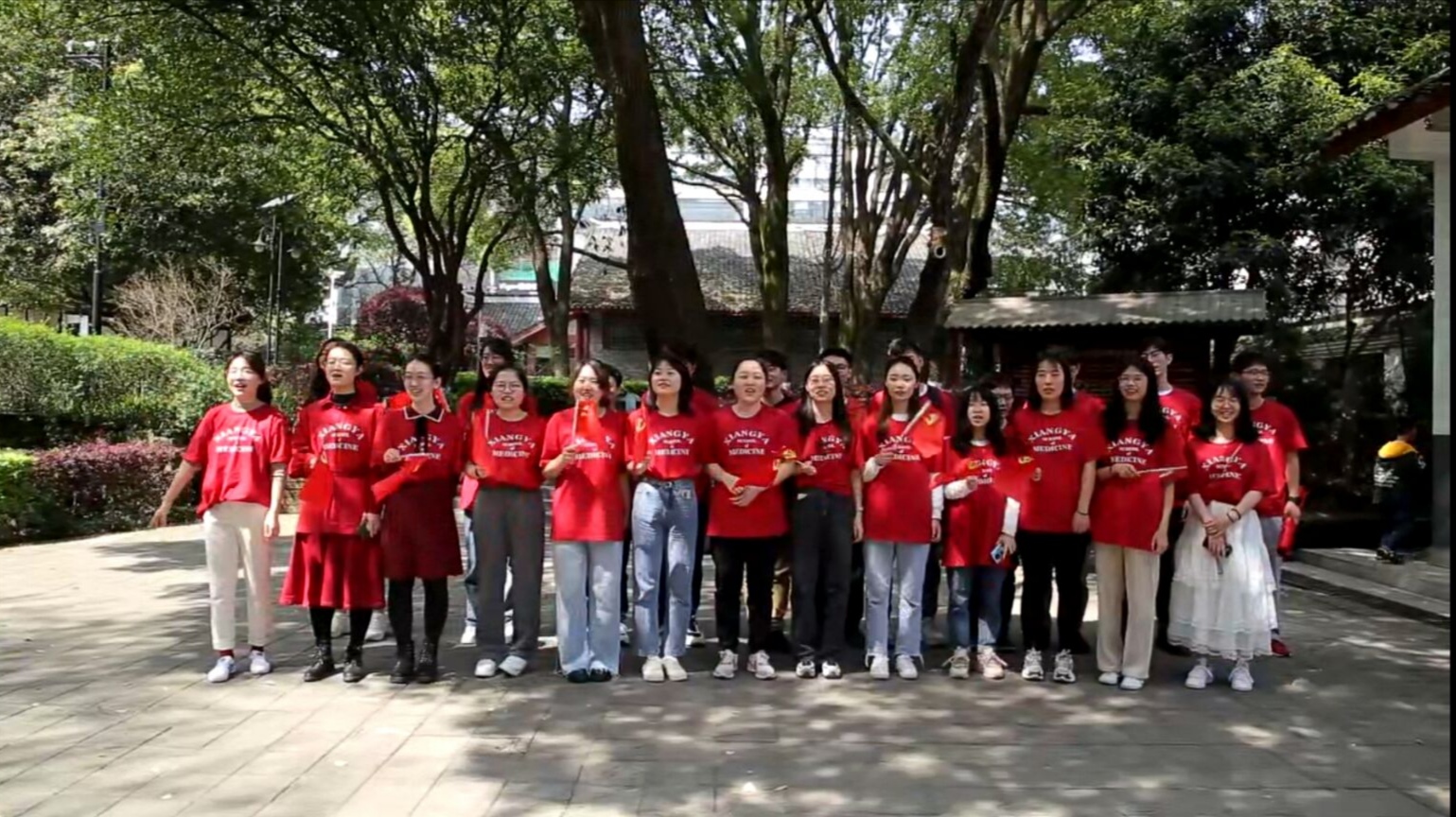 本次活动在全国人大代表、湘雅医学院党委书记黎志宏所授党课中《十三届全国人大四次会议精神学习》中拉开序幕,上午10点,湘雅医学院院领导、百名党员师生身着红色湘雅文化衫,在湘雅新校区前坪参与完成《党啊亲爱的妈妈》快闪录制。随着一阵悠扬的笛声响起,学院党支部同志们从四面八方汇聚而来,同志们挥舞着手中的红的党旗,饱含深情地齐唱红歌《党啊亲爱的妈妈》,以歌声怀念先辈、铭记历史,表达对党的无限热爱和深情祝福。紧接着,大家齐声朗诵,“建党百年,湘雅荣光;公勇勤慎,诚爱谦廉。”声音铿锵有力,湘雅人用嘹亮的歌声,深情的朗诵向祖国告白,向建党百年献礼。
