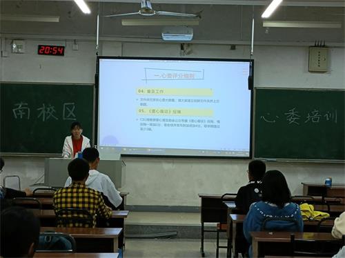 本次心委培训会主要包括心委事务、咨询预约、危机干预及答题和近期活动安排,经过心助会成员的前期准备和练习、各班心理委员的积极配合,心委培训会得以顺利开展。