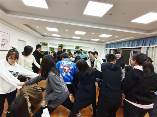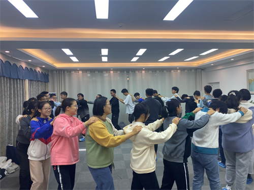 团辅活动分为五个环节。第一项活动为一场热身小游戏,大家围成一圈,双手搭在前面同学的肩膀上,一边转圈一边说“走起来啊走起来,揉揉头啊揉揉头,捶捶背啊捶捶背……”。这项活动打破了同学们的拘谨,使气氛热闹了起来。