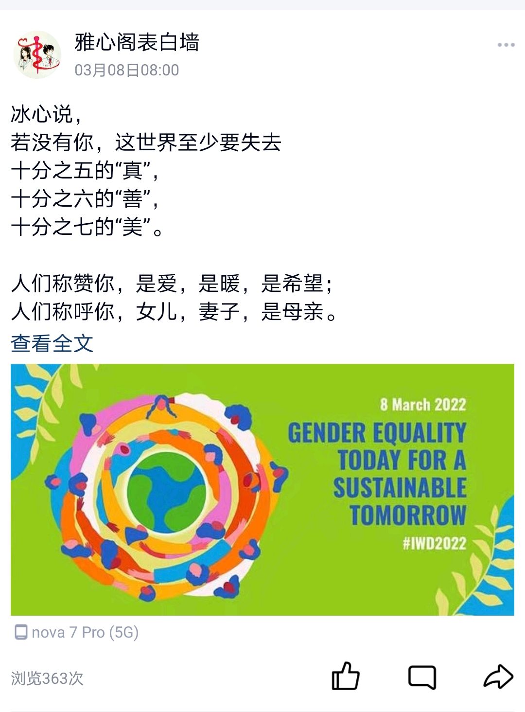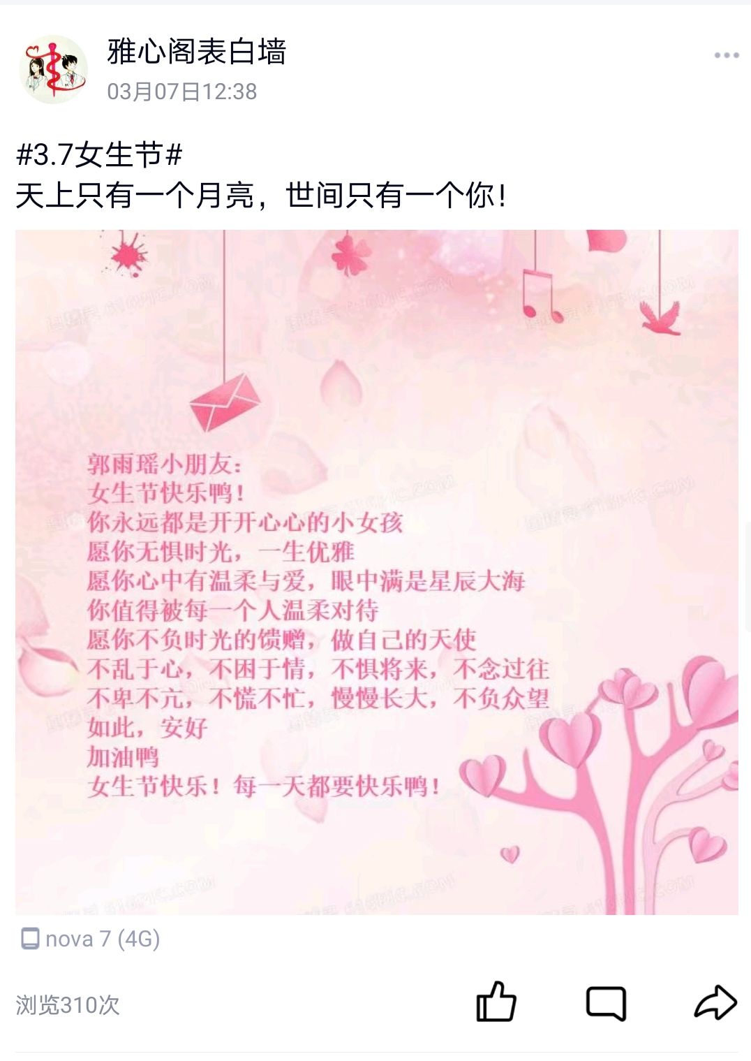 在心助会和各班心委的宣传下,同学们积极投稿,通过空间、朋友圈和对话的方式为女生送上温情祝福,不仅促进了同学间的真挚交流,而且引导了女生更多关注自己的美好,提高自信心,成为高校中的靓丽风景线。