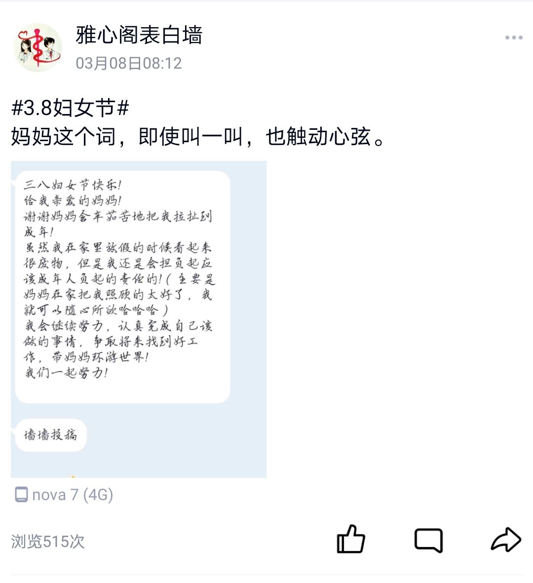 投递的稿件由心助会成员审核并筛选,合适的稿件在撰写官方祝福后通过空间或湘雅医学院公众号发出,让同学们在交流和分享的过程中把湘雅医学院当成心灵的“家”。