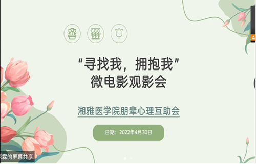 由湘雅医学院朋辈心理互助会主办的“寻找我,拥抱我”微电影观影会于2022年5月5日晚圆满结束。本次活动旨在分享“5·25”活动中优秀作品,帮助同学们审视自我,了解自己心理状态,以成为更加积极向上的青年人。