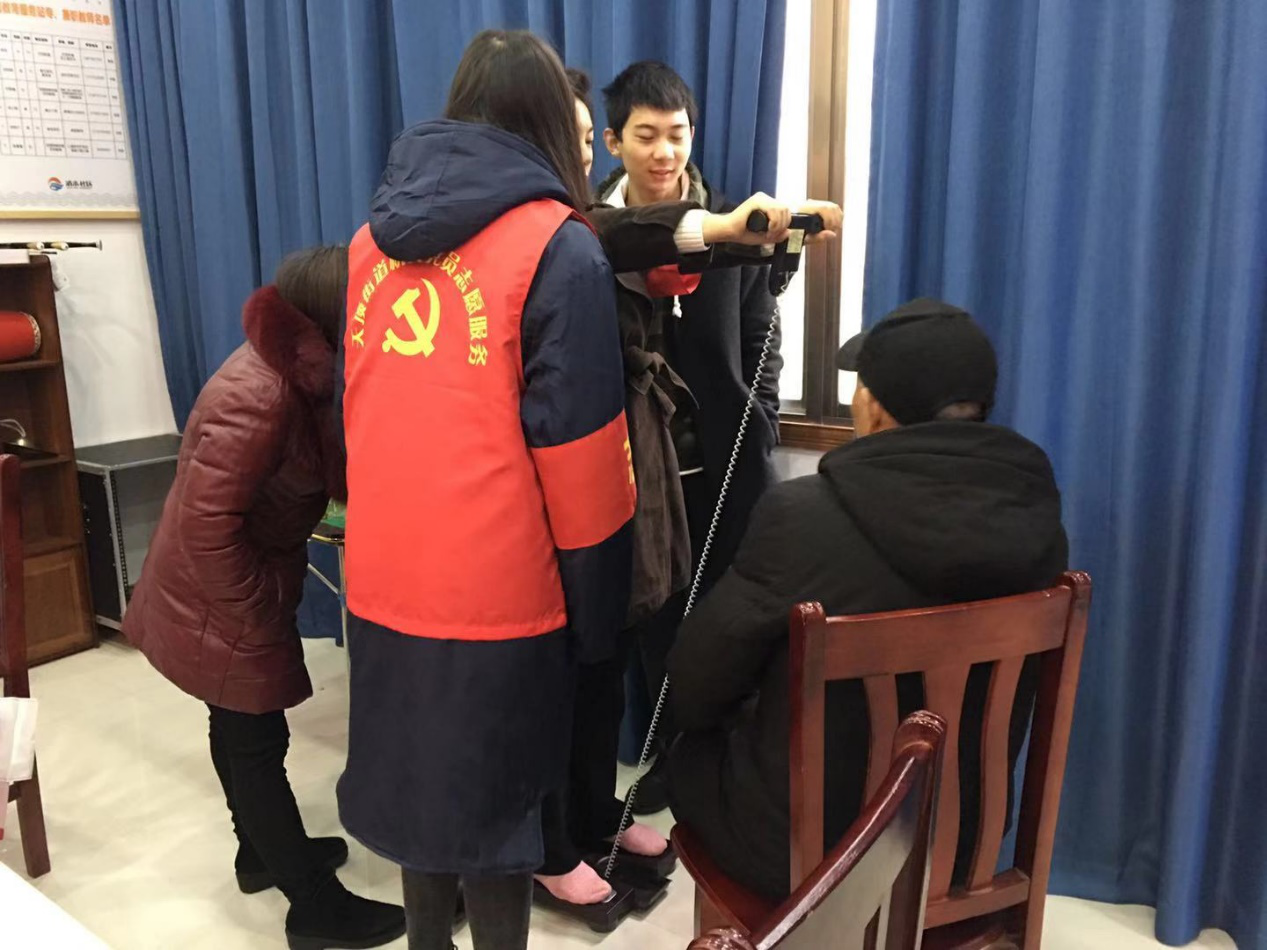 活动当天,首先由湘雅公共卫生学院的志愿者们组织义诊活动,为社区内的老人和儿童免费进行各项身体素质指标的检查,并运用课堂上所学习的医学知识,帮助老人和儿童解决卫生、保健等问题上的疑惑。