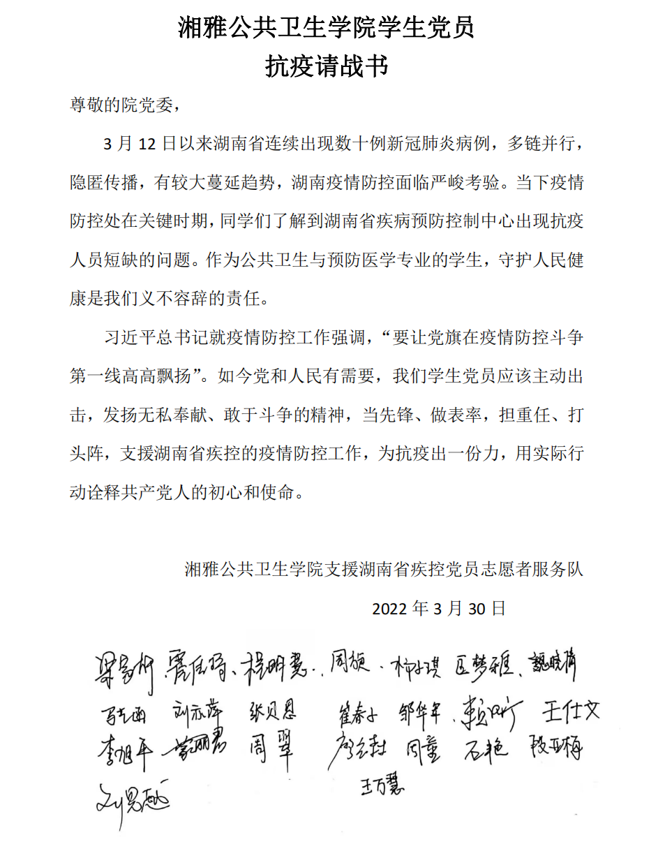 面对本轮疫情,湘雅公共卫生学院学生党员勇于亮身份、当先锋、做表率,主动请战,在很短时间内自发组成了包含20名党员在内的支援湖南省疾病预防控制中心疫情防控志愿者服务队。他们在请战书里写到:如今党和人民有需要,我们学生党员应该主动出击,发扬无私奉献、敢于斗争的精神,当先锋、做表率、担重任、打头阵,支援湖南省疾控的疫情防控工作,为抗疫出一份力,用实际行动诠释共产党人的初心和使命。
