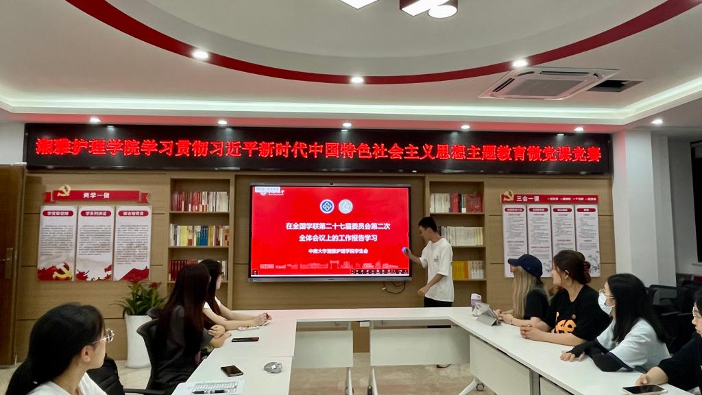湘雅护理学院学生会主席苏依林领学了学联工作的若干规定和工作规则,并结合组织改革要求,向学生会成员提出了巩固改革成果的若干措施。同时,她号召成员们要认真学习贯彻党的二十大精神,深刻领悟“两个确立”、增强“四个意识”、坚定“四个自信”、做到“两个维护”。最后,她结合实际情况,点明了湘雅护理学院学生会目前存在的不足,并对接下来的工作提出了展望。