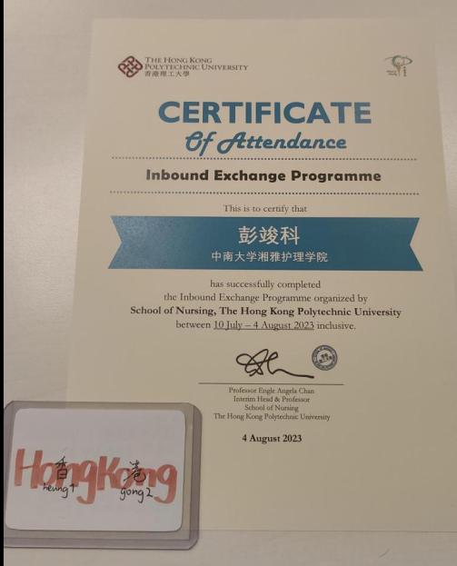 通过此次活动,湘雅护理学院5名学生都收获颇丰,并顺利获得香港理工大学2023年交流访学活动《结业证书》。本次赴香港理工大学交流访学活动圆满结束!