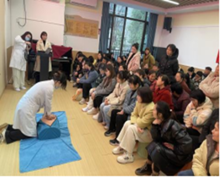 讲座现场,湘雅护理学院志愿者们通过专业讲解和实际演示,详细介绍了流感、手足口病等常见春季传染病的症状、传播途径及预防措施。同时,还进行了急救知识培训,包括心肺复苏(CPR)等实用技能的操作示范,让家长们掌握基本的急救技能,提升家长健康意识与应急处理能力。在活动过程中,家长们积极参与,认真听讲,现场气氛热烈。