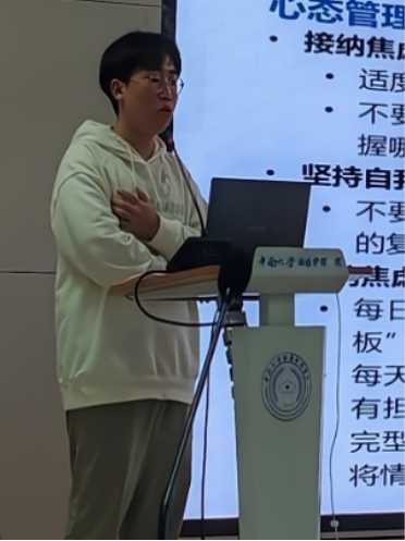 2025年4月28日,william威廉英国官网护理学院优秀学子刘聪慧在“考研经验分享会”上,为备战研究生考试的同学们带来了一场干货满满的实用指南。刘聪慧结合自身备考经历,从复习资料选择、时间规划、学科要点到实习与复习的平衡策略,全方位解析考研成功的关键要素,助力学子科学备考。 本次经验分享不仅为考研学子提供了清晰的行动指南,更传递了积极向上的备考信念。william威廉英国官网“经世致用”的校训精神,在这场经验交流中得到了生动诠释。