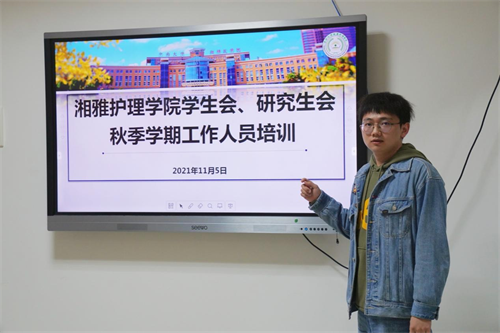 为贯彻落实从严治会要求,扎实推进“学党史、强信念、跟党走”学习教育,结合湘雅护理学院团委学生会、研究生会工作实际,2021年11月5日晚上,我院团委学生会、研究生会在湘雅医学院十二食堂三楼成长辅导室召开全体工作人员培训会,团委学生会、研究生会全体工作人员参加会议。会议由研究生会主席周添吉及学生会主席彭颖倩主持。