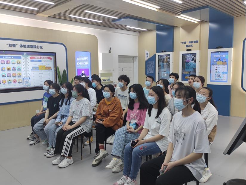 首先,讲解员组织大家一起观看了与友善相关的视频,通过这个视频,大家了解到了友善自古以来便是中华民族的传统美德,它与我们每个人的生活息息相关。随后,讲解员组织大家一起玩了一个小游戏,同学们两两之间通过玩“石头剪刀布”决出胜负,从而组成一条龙,直至全班同学一起组成了一条大龙。这个游戏帮助同学们放松了身心,从而更好地投入到此次课堂中来。紧接着,同学们通过脸部识别进行身份认证,并参与了与友善相关的答题活动,从而测得了各自的友善值。