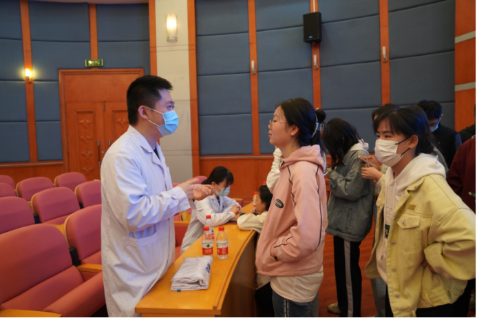 首先,湘雅护理学院本科生党支部支部书记张雅帆发言。她由衷感谢湘雅二医院优秀的皮肤性病科老师们来到现场,积极发挥党员的先锋模范作用,切实关心、关爱同学的健康成长,进入校园为同学们科普皮肤知识和进行义诊。她希望在两个支部的合作带领下,此项活动能够逐步常规化,成为将优势医疗资源引起校园的重要手段,让同学们享受高质量、高标准的医疗服务,提升健康素养,普及健康生活方式。