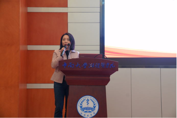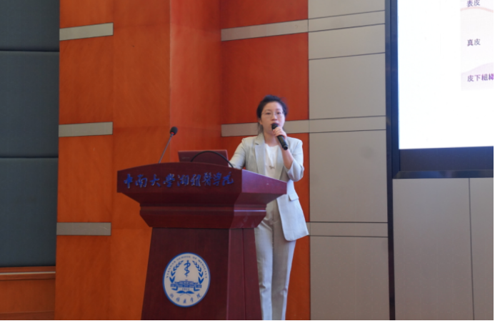 湘雅二医院医院皮肤性病科党支部支部书记湛意发言。她介绍到自1958年成立科室以来,经过几代人的努力科室的规模和实力都得到了巨大的发展,整体实力位居全国前列,专业领域在国内外都享有盛誉。她提到在5月25日全国护肤日来临之际,希望每个同学能够学到科学的护肤知识,规避一些常见的皮肤问题,正确、有效地护肤。