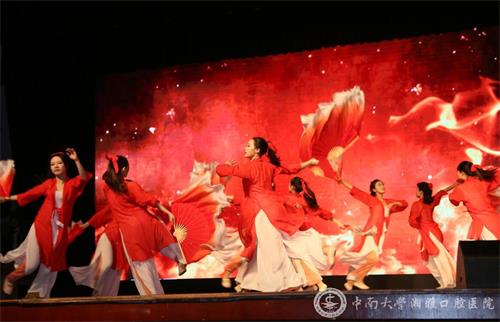 海口市人民医院远道而来,与口院师生携手共舞。一段《竹竿舞》,热烈欢快,别具一格的节奏深深地吸引着台下观众,传达了海口市人民医院与湘雅口腔医(学)院多年来在推进“双一流”进程中守望相助、共创繁荣的深厚革命情谊。