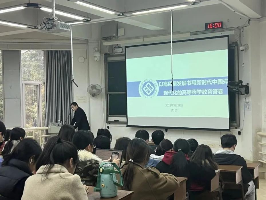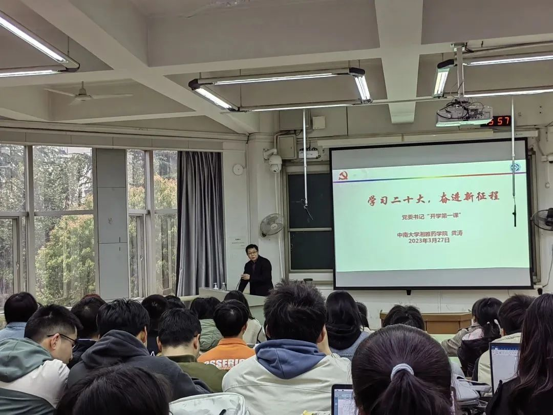 2023年3月27日下午,我院于湘雅新校区福庆楼T211教室举行“学习二十大、奋进新征程”主题教育活动。学院党委龚涛书记给师生们主讲“高质量发展书写新时代中国式现代化的高等药学教育答卷”的精彩一课。桂玲智老师、王地老师、唐春花老师和全院主要本科生和研究生干部及2022级硕士和博士参加学习。