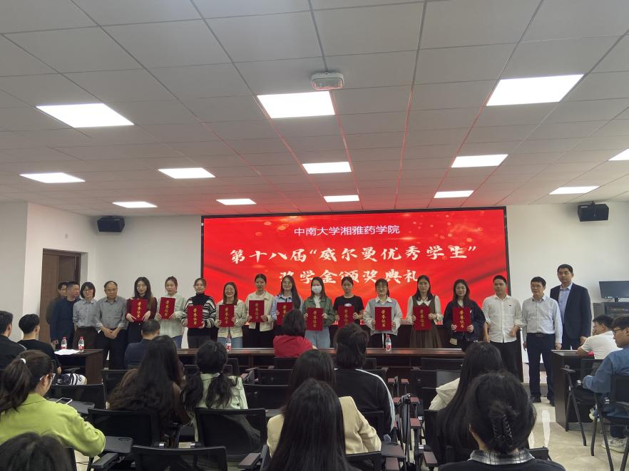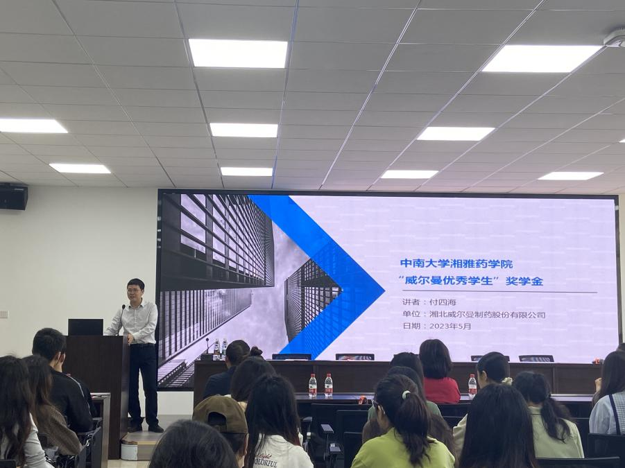 李乾斌副院长宣读获奖名单后,特邀嘉宾为获奖的二十二名同学颁奖,随后学业优秀奖获得者张晓楠发表获奖感言并代表全体获奖感谢公司;湘北威尔曼制药股份有限公司、威尔曼广州分公司研发总监付四海博士讲话,进一步增进大家对职业生涯、工作和就业的清晰认识。随后付总监还进行了招聘宣讲,在座同学们对威尔曼制药公司有了更深的了解,并且明白了所需人才应具备的能力。