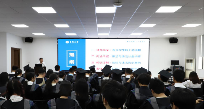 紧接着,王昊副书记以先辈们和身边中南人的廉洁故事为代表,为大家讲解了廉洁与廉洁从业的内涵所在。再通过对违纪与违法警示案例的分析,引起毕业生对于职业道德和行为规范的重视。
