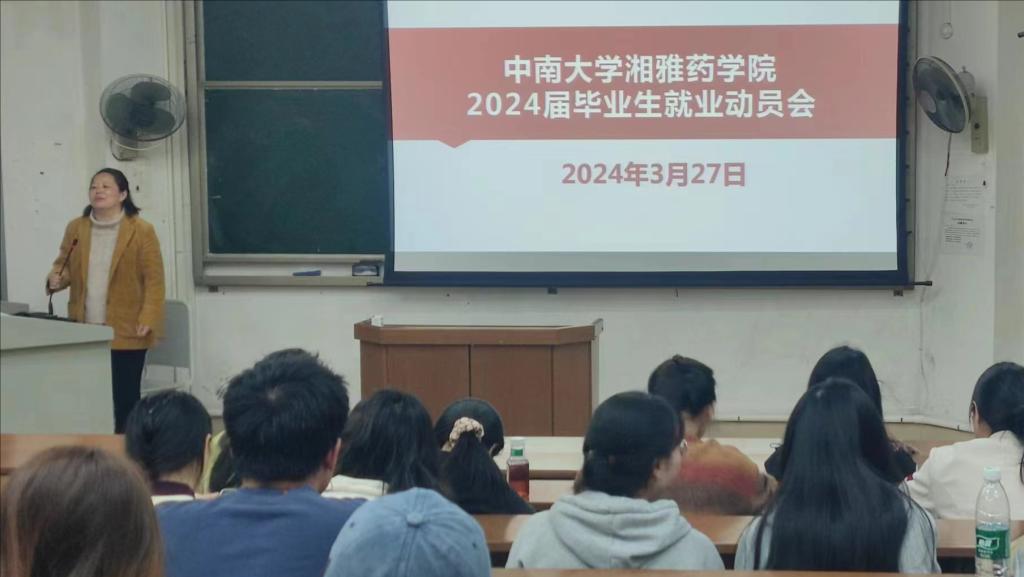 为切实做好毕业生就业指导工作,提高毕业生就业竞争力,湘雅药学院于2024年3月27日在T111教室举办2024届毕业生就业动员大会。湘雅药学院党委副书记唐媛、学工办主任桂玲智、辅导员唐春花以及湘雅药学院在校2024届毕业生参加了此次动员大会。本次会议由党委副书记唐媛主持。