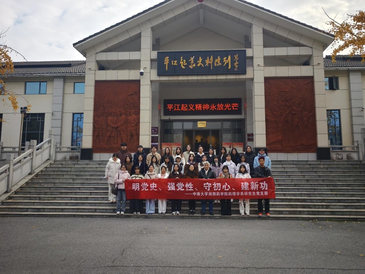 为传承红色基因、强化思想引领,2025年12月7日,湘雅药学院桂玲智老师带领湘雅药学院研究生会、研究生骨干代表,前往平江县开展为期一天的红色主题教育与实践研学活动。活动通过“红色历史学习+自然人文体验”相结合的形式,引导师生在追寻革命足迹中坚定理想信念,在感受绿水青山中凝聚力量。湘雅药学院关工委彭林老师一同带队前往。