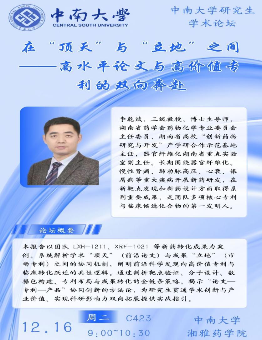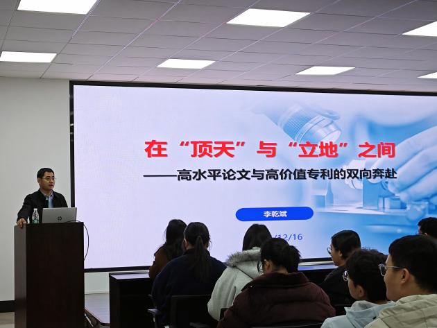 李乾斌教授作为湖南省药学会药物化学专业委员会主任委员,长期深耕重大疾病新药研发,拥有丰富的成果转化经验。在本场“在‘顶天’与‘立地’之间——高水平论文与高价值专利的双向奔赴”讲座中,他开宗明义指出学术研究的“前沿理论突破”与成果转化的“产业应用价值”并非割裂,而是相辅相成的创新双翼,二者协同是医药科技创新的关键。