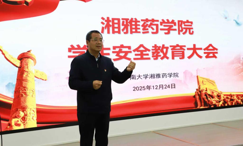 为深入贯彻落实学校校园安全工作部署,切实强化学生安全防范意识,保障学生健康成长与学院稳定发展,2025年12月24日,湘雅药学院在杏林校区药学楼召开学生安全教育大会。学院党委书记胡平安主讲,学生工作办公室主任、各年级辅导员及全体学生党员参会,会议由桂玲智主持。