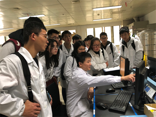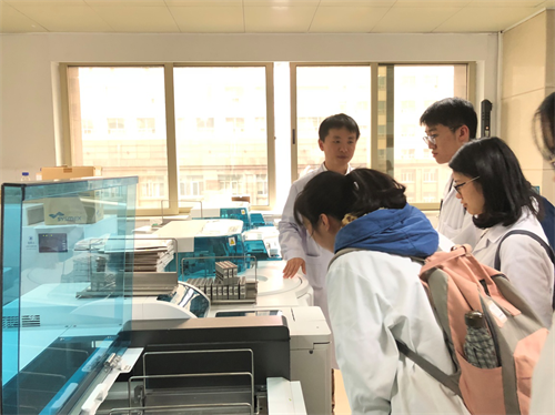 参观开始前,唐玲丽教授向同学们表示欢迎并介绍了本次参观的讲解员。随后同学们进入了检验科工作室,首先同学们从进行检验前分拣的地方——前处理区开始参观。在免疫检验区,讲解员向同学们介绍了免疫检验的原理、方法、机器,并给大家示范了如何进行检测。