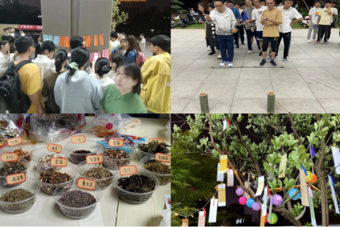 舞龙结束后同学们纷纷四三开来,参与到不同的活动中来。中秋猜灯谜,猜的不仅是谜面,还是热闹,是团圆,是文化。同学们成群地围在灯谜前,兴致勃勃地讨论着谜底,分享着这一角的欢乐。迷迭香,香茅草,白芷,金银花,丁香……独属于中草药的清苦味道,和精致的小小香包碰撞在一起,就成了辟邪驱瘟的美好愿景的载体。投壶即“投福”,同学们站在规定线外,紧盯着壶口,不敢有丝毫松懈。“寸心只在所投中,出手何曾一箭空。”愿各位,投财纳福,所投皆中。当月上梢头,同学们在祈愿签上一笔一划地写下愿望,祈愿事事顺心,向空中的那轮明月寄托祝福。