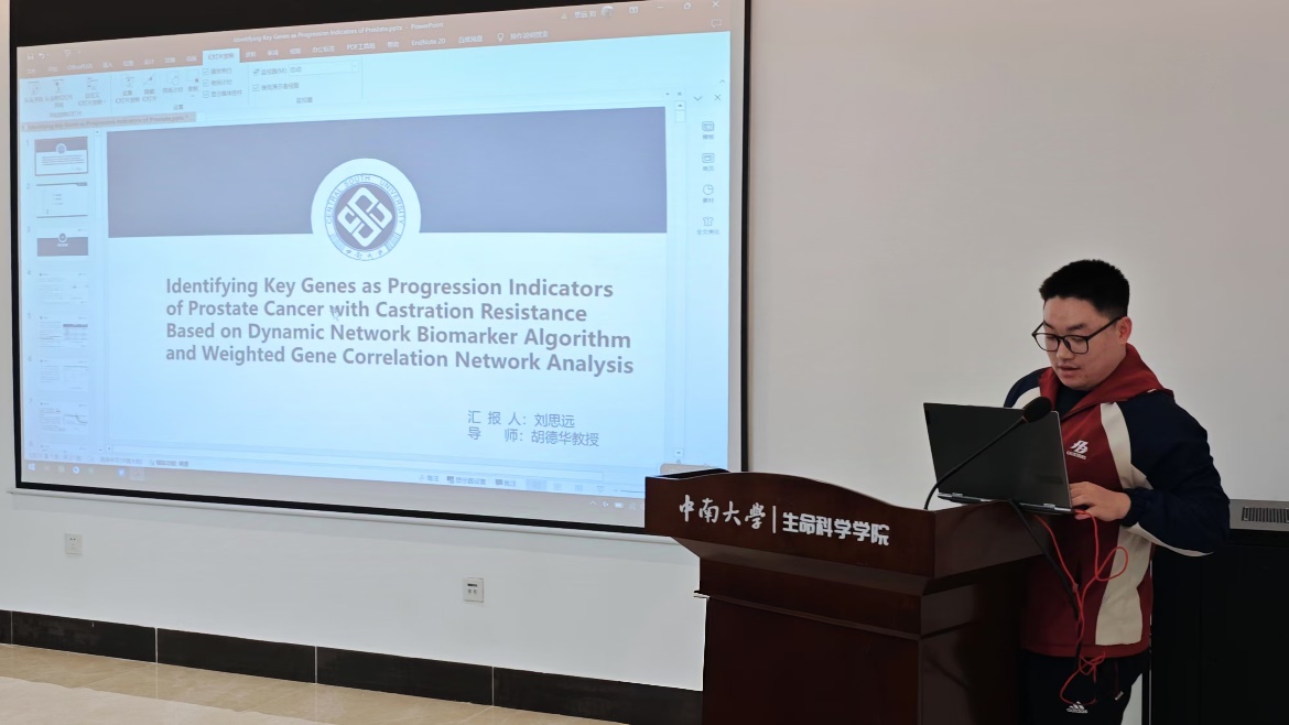 2021级博士研究生刘思远以“Identifying Key Genes as Progression Indicators of Prostate Cancer with Castration Resistance Based on Dynamic Network Biomarker Algorithm and Weighted Gene Correlation Network Analysis”为题做了详细深入的学术报告。报告的核心内容主要围绕了原发性前列腺癌进展为去势抵抗型前列腺的关键风险因素,结合动态网络标志物和加权共表达分析方法鉴别了前列腺癌进展的关键基因。这一研究成果不仅有助于提高对前列腺癌进展和去势治疗的理解,还为前列腺癌治疗和预后分析提供了潜在靶点。王诗翔老师对报告内容进行了点评并指出,可从前列腺癌免疫微环境等方面继续深入研究。