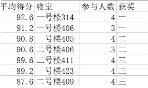 同学们齐心协力,各展所能,让小小的宿舍空间绽放出了别样的光彩。在本次活动中,我们不仅看到了干净整洁的宿舍环境,还感受到了温馨和谐的宿舍氛围。这是一次宿舍凝聚力的锻炼,也是一次良好生活习惯的培养。学院学生会寝室评选小组通过对宿舍文化,口号,荣誉等多方面的综合评估,最终的比赛结果如下: