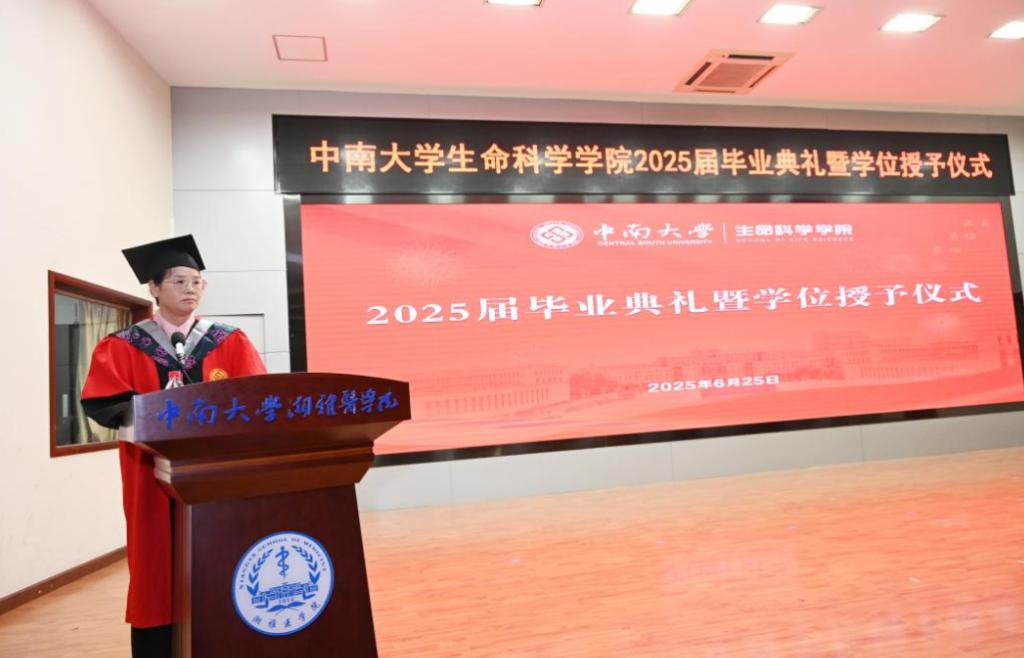 生物科学专业T2101班李永聪同学代表本科毕业生进行发言。她回顾本科生四年求学生涯,动情的讲述了从潇湘校区、麓南校区到杏林校区的成长足迹。2022级图书情报专业硕士研究生郭贝怡作为研究生代表发言。她说“探索”是这一旅程的主旋律,是不断追求真理和创新的过程。教师代表黄皓老师在“最后一课”中,向毕业生们送上三颗“星”的寄语:一是自信之星;二是热爱之星;三是责任之星。学院副院长胡德华宣读了毕业校友联络员名单,并为受聘的校友联络员颁发聘书,勉励大家与母校同心同向、携手并进,共同书写母校的光辉篇章!离别之际,学院院长李家大寄语2025届毕业生,深情送上四个“爱”,一是爱生活;二是爱家庭,家庭是永远的港湾,应珍惜与亲人相处的每一;三是爱专业;四是爱工作。