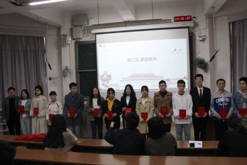伴随着中国共青团团歌唱响,大会拉开了帷幕。首先,院团委书记陈梅明老师对往届团学会的工作以及全体成员的努力给予了认可与肯定,并向他们颁发了聘书。