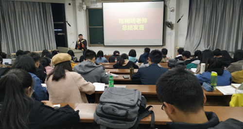 各部门汇报展示完毕后,生命科学学院团委书记陈梅明老师为此次活动做总结致词。陈老师充分肯定了本次答辩大会,同时也对团学会各部门各成员提出要求:希望大家要有强烈的责任意识、服务意识,将工作落到实处,切实为同学们服务,为共同构建积极向上、青春活力的生科团学大家庭而努力。