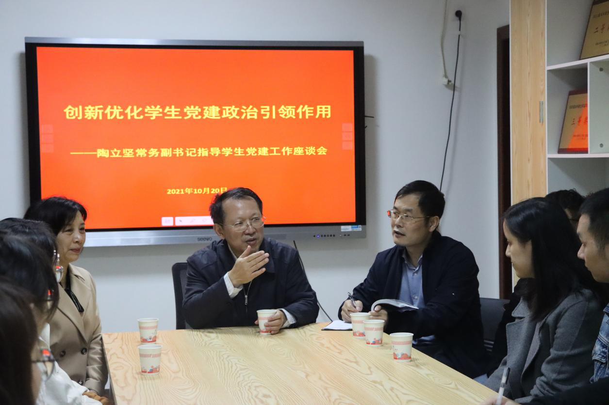 谈及优化创新优化学生党建政治引领作用,陶立坚同志指出高校党建工作是基层党建工作的重要部分,要在习近平新时代中国特色社会主义思想的指导下,坚持“党的一切工作到支部”的鲜明导向,突出政治功能,强化政治引领。学生党建在思想引领方面要脚踏实地实事求是的根据现有条件创造性的开展,要根据青年人思维活跃的特点去正确引导,要善于发现群众面临的痛点去着力解决帮扶。比如学生党员如何在校内更好发挥先锋模范作用,如何将自己所学知识本领融入到基层百姓需求之中融入到社会主义现代化建设之中,都是要不断的去思考去探索去实践。