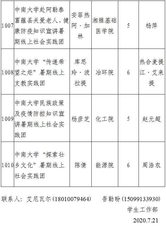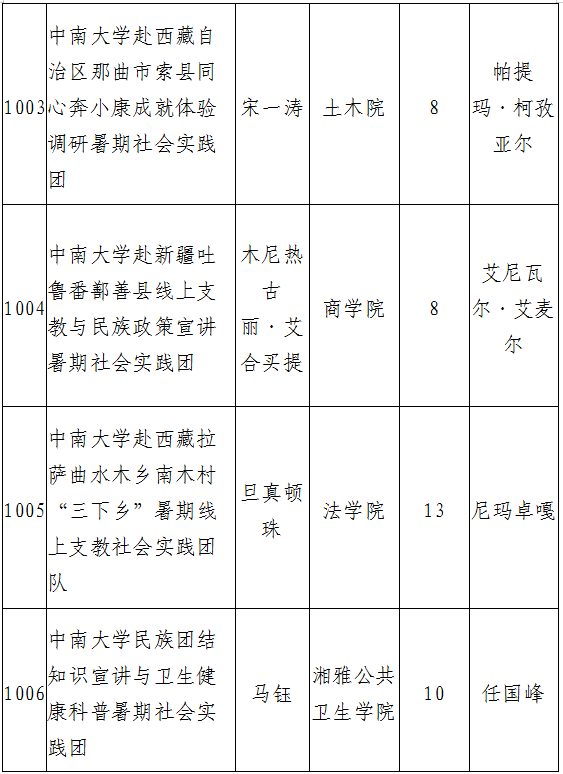根据学校暑期社会实践活动总体安排,由学工部设立了“56度中南”暑期社会实践专项,以“同心奔小康、砥砺爱国情”为主题,在实践中深化民族团结进步教育,引导同学们铸牢中华民族共同体意识,厚植家国情怀。经团队申报,学院推荐,共收到申报项目18项。根据相关通知精神,经组织专家评议,学生工作部部务会审定,确定10个项目为立项项目,每项支持经费2000元。项目具体情况如下: