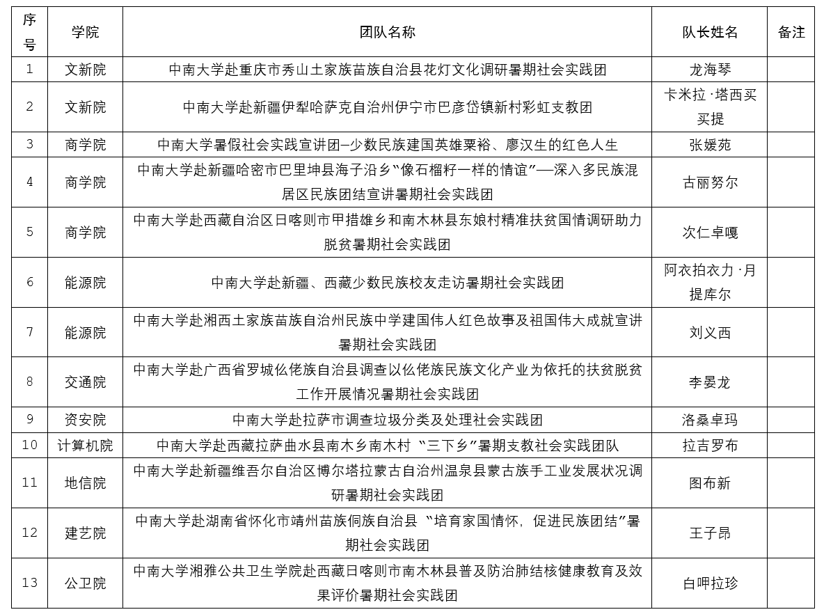 经团队自主申请,学院审核推荐,专家评审委员会初审、终审,拟立13支“56度中南”少数民族学生暑期社会实践活动专项,开展暑期实践活动,公示结果如下(排名不分先后):