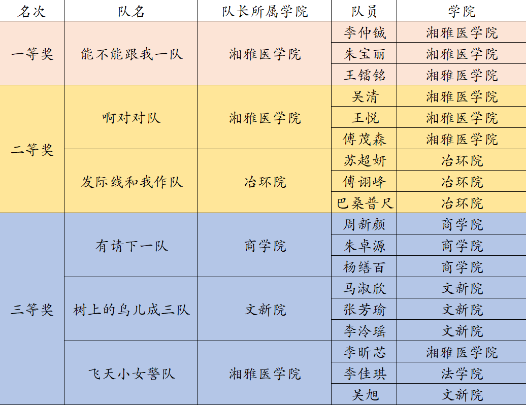 经过激烈角逐,共有6支队伍脱颖而出。“能不能跟我一队”勇夺桂冠获得一等奖,“啊对对队”和“发际线和我作队”获得二等奖,“有请下一队”、“树上的鸟儿成三队”和“飞天小女警队”获得三等奖。姚勇副部长、陈文老师、万可老师分别为各获奖队伍颁发证书及奖品。