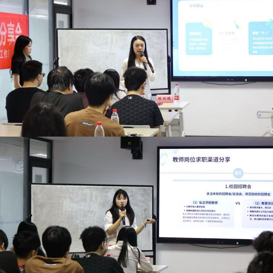 随后,会议进入就业经验分享环节。林丽缇同学分享了自己的实习经历,对校招投递渠道、港澳台实习信息渠道进行了介绍,分享了利用互联网资源进行检索的技巧,建议同学们明确目标,尽早准备。洪嘉鑫同学从方向规划、简历制作等方面展开叙述,以研三时间线为例,分析了从秋招到春招的半年内应如何做好规划和准备。她重点对读博、考公、就业三方面的选择进行了解析,为同学们选择自身发展方向提供参考。连如玉同学则以自身经历为例,从求职渠道和就业准备两大板块入手,围绕教师岗位求职进行经验分享。