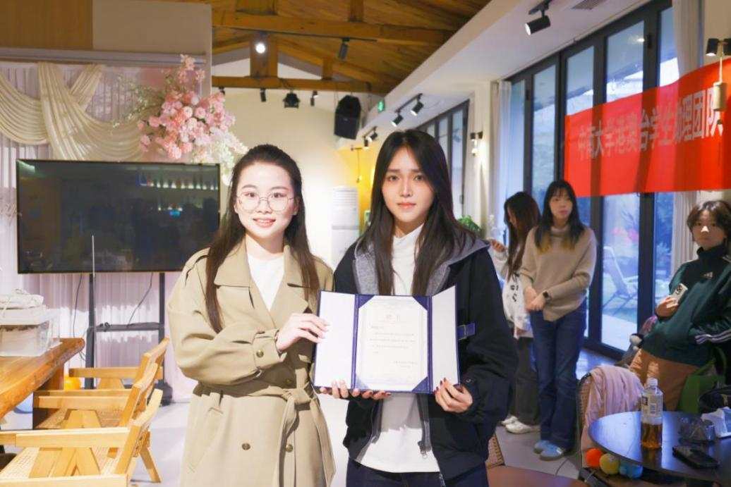 致辞结束后,激动人心的聘书颁发与“学风建设先锋”表彰环节如期举行。指导老师共同为成员颁发聘书,为表现突出的“学风建设先锋”授予荣誉证书,掌声中满含对团队未来的殷切期许。随后,团队成员代表向老师们献上精心制作的手作花盒与手写有“勤学笃行”字样的书法作品,以感谢老师们在学业指导、学风引领等方面的悉心付出,温馨互动让现场氛围愈发融洽。