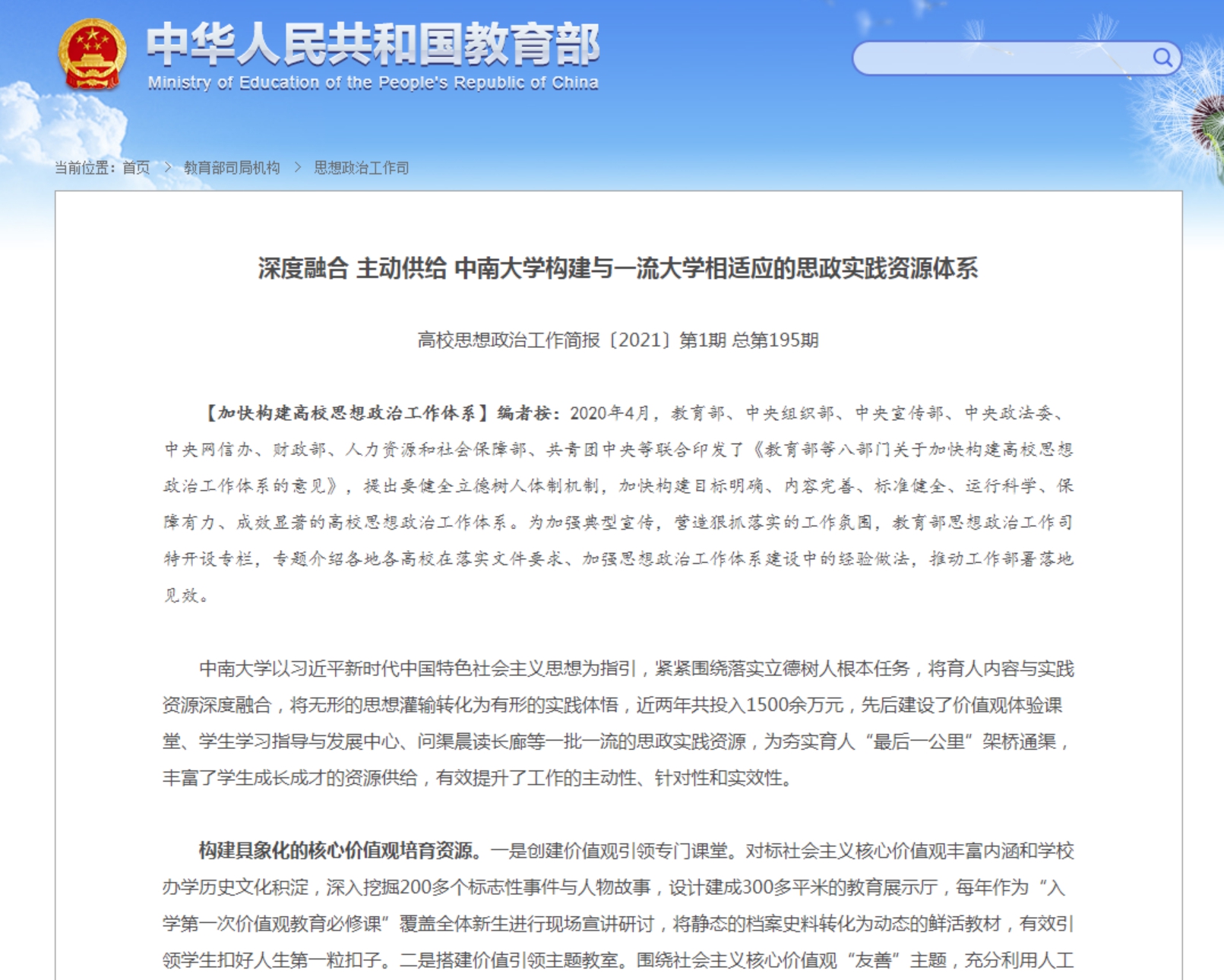 近年来,在学校党委领导下,党委学生工作部紧紧围绕“立德树人”根本任务,聚焦“厚植情怀、涵养学风、精准服务、赋能青春”主体内容,立足“升级硬环境,改善软环境”总体思路,遵循“引领——体验——实践”主要路径,采用体验式、互动式、分众式等重要方式,努力推动理论小课堂同实践大课堂相结合,推动育人内容与实践资源相融合,推动无形的思想灌输转化为有形的实践体悟,先后建设了一批符合时代需求、富有中南特色、体现实践要求的校园思政实践资源项目,进一步丰富了学生成长成才资源供给,取得积极育人成效。