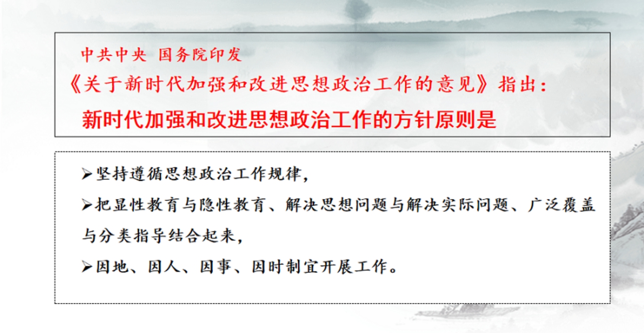 中共中央、国务院《关于加强和改进新形势下高校思想政治工作的意见》、教育部《高校思想政治工作质量提升工程实施纲要》、教育部等八部门《关于加快构建高校思想政治工作体系的意见》、中共中央、国务院《关于新时代加强和改进思想政治工作的意见》等先后就着力推动“三全育人”综合改革、完善思想政治工作体系、推动显性教育与隐性教育相结合等做了系统部署,为做好高校思想政治工作明确了具体遵循。