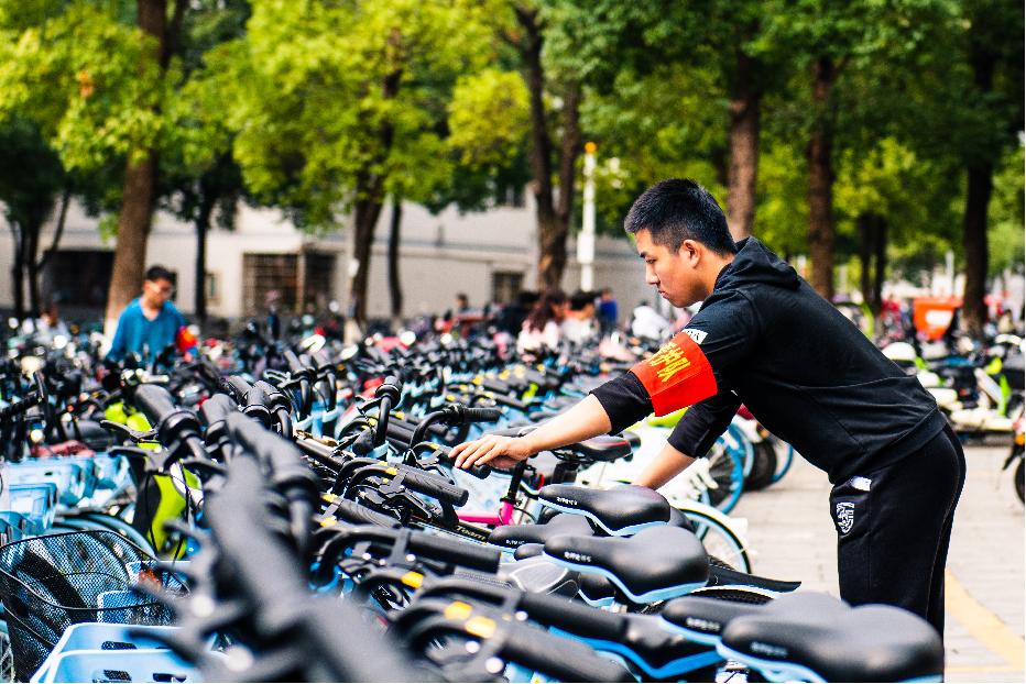 交通文明服务队主要工作任务是规范校内自行车和电动车的摆放,保证所负责区域自行车和电动车有序停放、美观,保证校园道路通畅。交通文明服务队年均引导自行车规范摆放15万辆次。